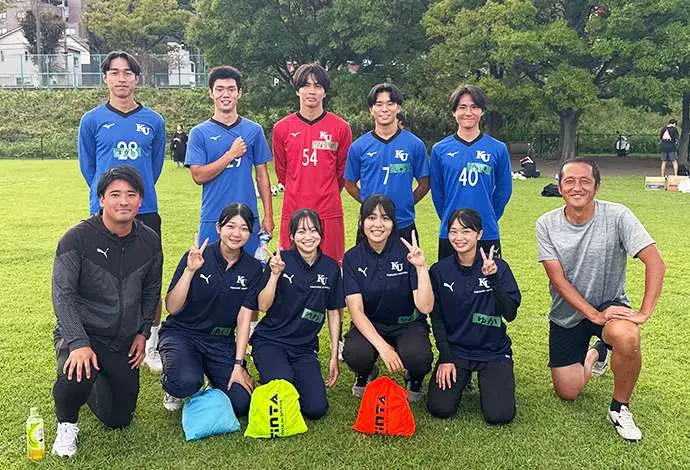 このイベントは、(公財)藤沢市まちづくり協会、(一社)神奈川県サッカー協会、本学サッカー部・女子サッカー部、(株)バイオクロマトが協力し、藤沢市の公園の活性化を目的に、サッカーの経験を問わず誰でも天然芝でサッカーを楽しめるイベントとして開催されました。