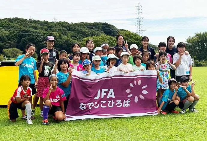 当日は約140名の子どもたちが参加。幼児(年中~年長)を対象にした「キッズパーク」、小学生女子を対象とした「女子サッカーなでしこひろば」、中学生女子を対象とした「サッカークリニック」の区分に分かれ、公園内の広いフィールドで各々サッカーを楽しみました。