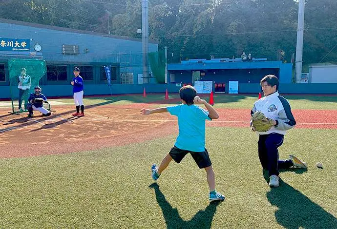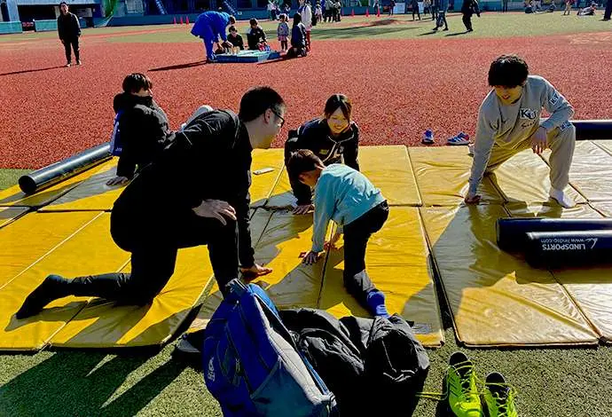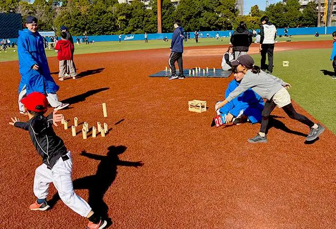 普段立ち入ることのない野球場で、スピードガンをはじめモルックやミニサッカー、バスケットボール、フラッグフットボール等の種目を、小学生のお子様と神大生が一緒になって楽しむ姿が印象的でした。