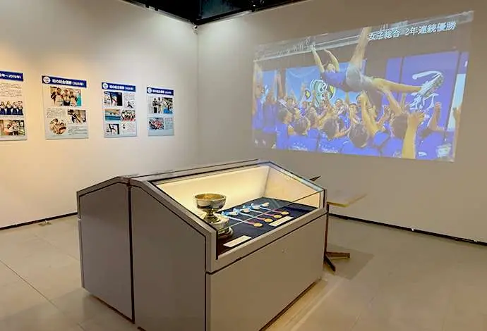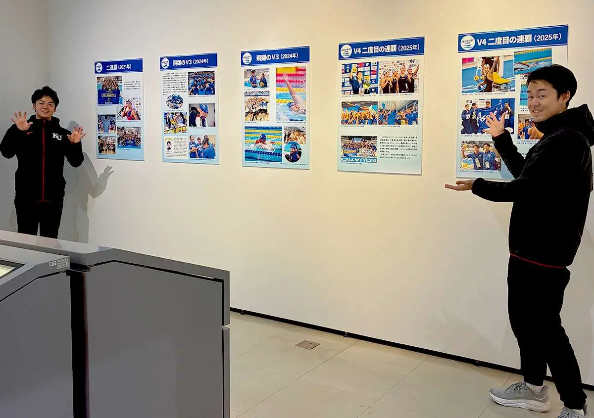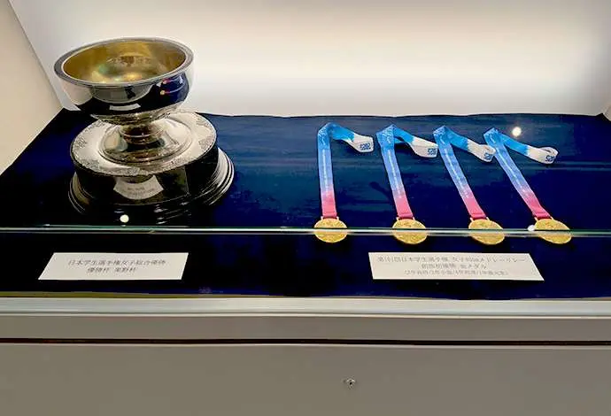 第101回日本学生選手権水泳競技大会(インカレ)で、2年連続4回目の女子総合優勝を果たした本学水泳部の功績を称え、これまでの軌跡を振り返り、今後のさらなる活躍を祈念した特別展示を本学横浜キャンパス3号館の企画展示室で開催しています。