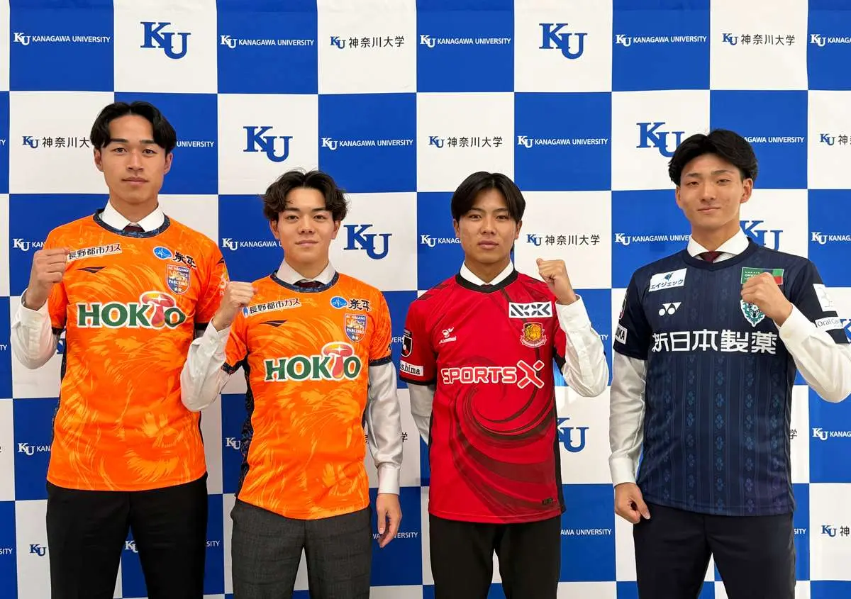 | 出席者 | 藤田 仁朗 選手(経済学部4年) 2026シーズンより福島ユナイテッドFCへ加入内定 尾崎 裕人 選手(人間科学部4年) 2026シーズンよりAC長野パルセイロへ加入内定 渡邉 禅 選手(人間科学部4年) 2026シーズンよりAC長野パルセイロへ加入内定 前田 快 選手(人間科学部3年) 2027シーズンよりアビスパ福岡へ加入内定 高橋 厚 部長 大森 酉三郎 監督 |