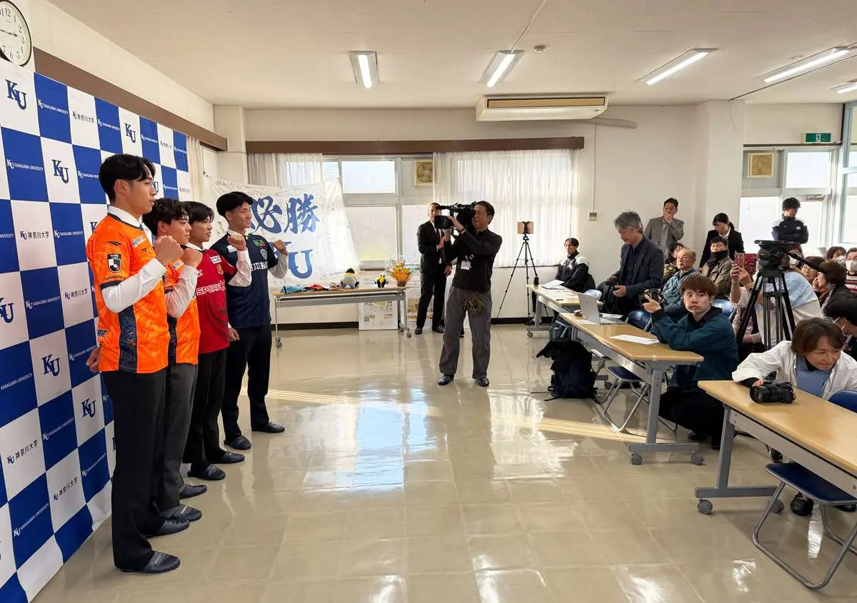 2025年12月10日(水)、本学サッカー部に所属する4選手がJリーグ各チームへの加入内定したことから、部員たちが寮のように生活している竹山団地において、合同記者会見を開催しました。