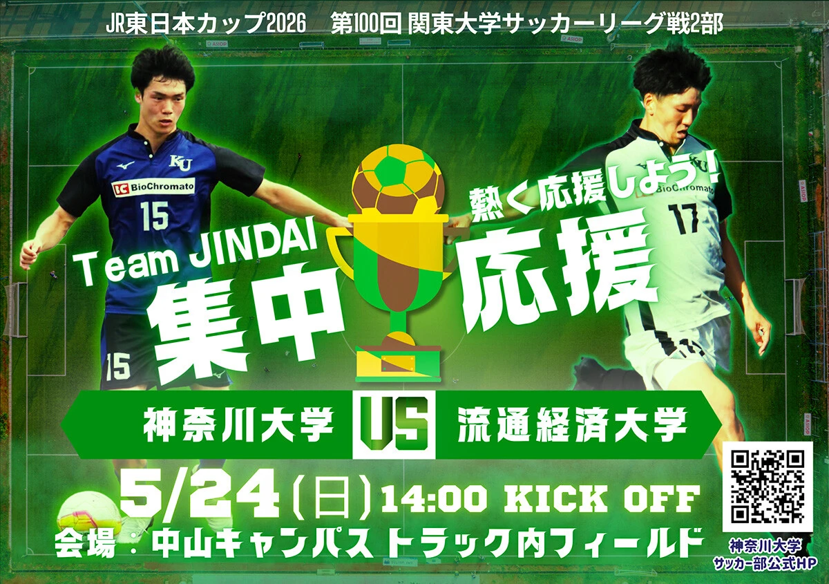 2026年5月24日(日)、神奈川大学附属中・高等学校(中山キャンパス)トラック内フィールドで行われるJR東日本カップ2026 第100回関東大学サッカーリーグ戦 2部の試合において、学生・教職員の「集中応援」(特別応援企画)を実施します。
